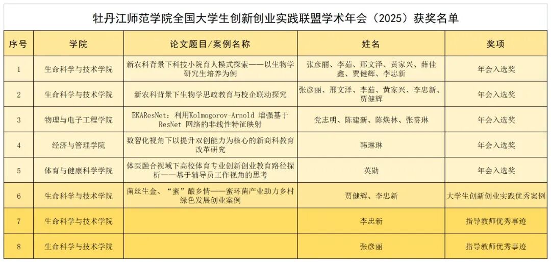 大学生创新创业实践优秀案例“菌丝生金,‘蜜’酿乡情——蜜环菌产业助力乡村绿色发展”依托高校科研力量,构建了从研发、种植到销售的完整产业链。通过“政府+学校+团队+农户”的联动模式,项目开发了多元产品,切实带动了当地就业与农民增收,是产学研结合推动乡村产业发展的典型案例。“指导教师优秀事迹”获得者李忠新、张彦丽两位老师在育人模式创新领域开展了卓有成效的探索。他们以学科竞赛与创新创业实践为抓手反哺课堂教学,不仅指导学生在全国性赛事中崭露头角、斩获佳绩,还有效促进了科研成果赋能地方发展。年会现场举行了隆重的颁奖仪式,李忠新老师作为我校获奖代表上台领奖。未来,学校将不断完善创新创业教育体系,推动创新创业教育与专业教育有机融合,将创新创业教育融入人才培养全过程,为培养应用型创新人才贡献力量。